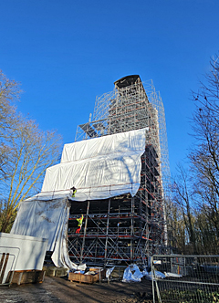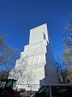 Der Förderturm wurde 2025/26 eingerüstet und verschwindet für einige Zeit unter einer