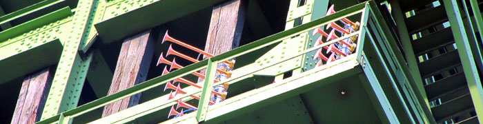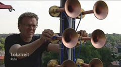 Drucklufthörnern spielen die Komposition. Das raumübergreifende Konzert hört man nicht