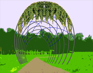 Skulptur eine Symbiose mit der Natur ein. Berankt durch Kletterpflanzen, ist es ein einladendes